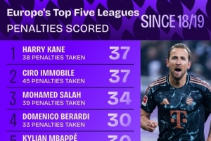 18-19賽季以來五大聯(lián)賽點(diǎn)球進(jìn)球排名: