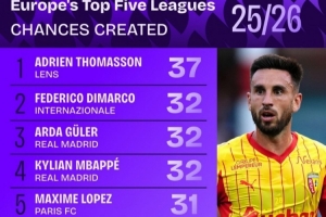 本賽季五大聯(lián)賽創(chuàng)造機(jī)會(huì)榜:
