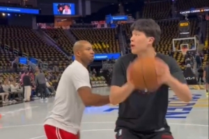 賽前,楊瀚森在助教陪同下進(jìn)行熱身,對(duì)抗后連續(xù)勾手命中,同時(shí)送出單臂暴扣,三分7中7。