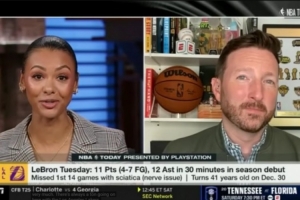 體育資訊11月22日訊 今天的《NBA Today》節(jié)目,主持人Malika Andrews連線了自己的老公、湖人隨隊(duì)記者Dave McMenamin,聊到了詹姆斯復(fù)出后的安排。
