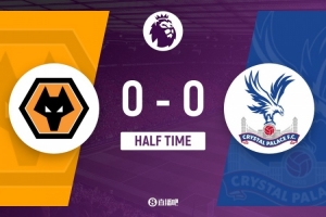 傷停補(bǔ)時(shí)1分鐘。上半場(chǎng)比賽結(jié)束,狼隊(duì)0-0水晶宮。