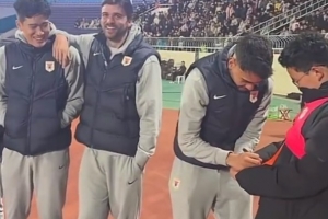 澤卡、馬德魯加、彭嘯來到了比賽現(xiàn)場,與當?shù)厍蛎曰印?/p>