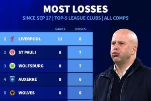 體育資訊11月24日訊 德轉(zhuǎn)統(tǒng)計了自9月27日以來五大聯(lián)賽球隊的輸球榜,利物浦以8場比賽高居榜單第一位。