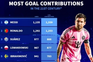 體育資訊11月24日訊 《轉(zhuǎn)會(huì)市場(chǎng)》統(tǒng)計(jì)了新世紀(jì)各項(xiàng)賽事直接參與進(jìn)球情況,梅西力壓C羅居首。