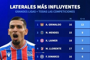 體育資訊11月25日訊 德國轉(zhuǎn)會市場統(tǒng)計了本賽季五大聯(lián)賽邊衛(wèi)的參與進球數(shù)量,并列出榜單,格里馬爾多參與12球居首,努諾·門德斯參與8球次席。