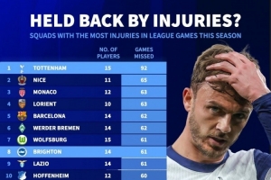 體育資訊11月25日訊 德國轉會市場統(tǒng)計了本賽季五大聯(lián)賽球隊的球員傷缺場次,并列出榜單,熱刺15人次累計傷缺92場最多,巴薩14人次傷缺62場第五。