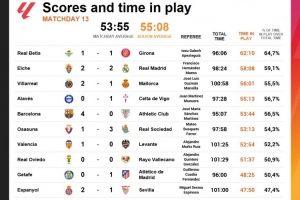 體育資訊11月25日訊 Opta統(tǒng)計了西甲第13輪比賽的凈比賽時間,本輪場均凈比賽時間為53分鐘55秒,而本賽季西甲場均凈比賽時間為55分鐘8秒。