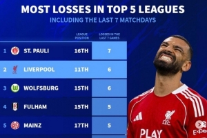 體育資訊11月26日訊 利物浦在本輪英超主場0-3慘敗諾丁漢森林,延續(xù)了近期糟糕表現(xiàn),《轉(zhuǎn)會市場》也統(tǒng)計了五大聯(lián)賽近7輪輸球最多情況,利物浦位列次席。
