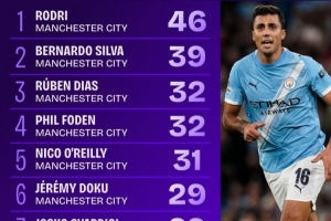 體育資訊9月19日訊 著名數(shù)據(jù)網(wǎng)站Squawka統(tǒng)計了歐冠首輪進攻三區(qū)傳球數(shù)據(jù),羅德里46次居首,曼城球員包攬前十。
