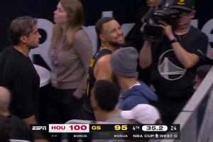 GIF-庫里暫停時坐不住 坐下突然彈起