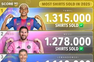 體育資訊11月28日訊 Score 90援引Euromericas Sport Marketing數(shù)據(jù),統(tǒng)計(jì)了2025年截至目前世界足壇的球員球衣銷(xiāo)量榜,亞馬爾以131.5萬(wàn)件排名第一,梅西第二,C羅位列第七。
