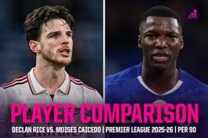 體育資訊11月28日訊 北京時間12月1日凌晨,切爾西將在英超第13輪比賽中主場對陣阿森納,Opta對比了賴斯和凱塞多本賽季英超的數(shù)據(jù)。