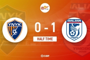 傷停補時3分鐘。上半場比賽結(jié)束,云南玉昆0-1大連英博。
