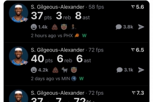 賽后美媒Real Sports曬出了亞歷山大近三戰(zhàn)數(shù)據(jù),寫道:“SGA應(yīng)進(jìn)入歷史級別得手的討論。”
