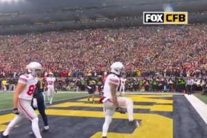 體育資訊11月30日訊 今日俄亥俄州立大學(xué)橄欖球隊(duì)外接手布蘭登·伊尼斯在對(duì)陣密歇根大學(xué)的比賽中完成達(dá)陣。