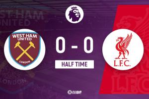 上半場補時1分鐘,西漢姆聯(lián)0-0利物浦。