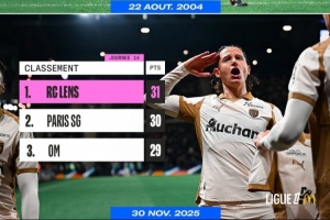 體育資訊12月1日訊 法甲第14輪,朗斯客場(chǎng)2-1擊敗昂熱,14輪過(guò)后10勝1平3負(fù)31分位列法甲積分榜首位。