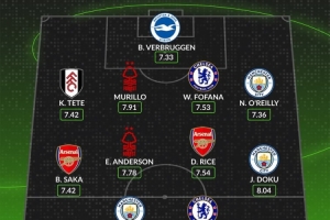 中場(chǎng):薩卡(阿森納,7.42分)、埃利奧特·安德森(諾丁漢森林,7.78分)、賴斯(阿森納,7.54分)、杰里米·多庫(kù)(曼城,8.04分)