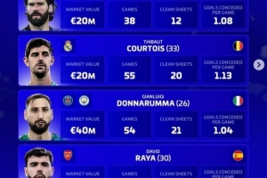 阿利松(利物浦,33歲,巴西):身價(jià)2000萬,38場(chǎng),12零封,場(chǎng)均丟1.08球