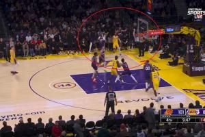 末節(jié)9分48秒,時(shí)間靜止,湖人的進(jìn)攻時(shí)間也鎖定在了15秒,這個(gè)回合最終文森特轟進(jìn)底角三分