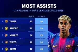體育資訊12月2日訊 德國轉(zhuǎn)會市場統(tǒng)計了U19球員在五大聯(lián)賽中的助攻次數(shù),并列出榜單,亞馬爾30助居首,桑喬20助次席。