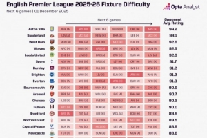 體育資訊12月2日訊 opta分析了英超各隊未來6輪的賽程難易程度,維拉賽程最為艱難,利物浦最容易。曼城第二容易,曼聯(lián)并列第三容易。