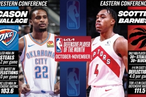 體育資訊12月3日訊 今日NBA官方公布了10-11月東西部月最佳防守球員,雷霆球員卡森·華萊士和猛龍球員斯科蒂·巴恩斯分別當(dāng)選。