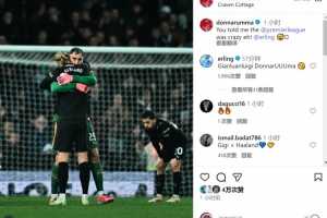 曼城門(mén)將多納魯馬社媒曬出與哈蘭德?lián)肀У恼掌湮模骸澳阍缇透嬖V過(guò)我英超很瘋狂,是吧!??”