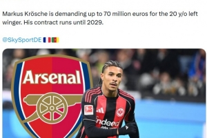 報道稱阿森納已經明確展現出對這位20歲左邊鋒的興趣,有意在夏窗引進,法蘭克福也對此已經知悉。法蘭克福體育總監(jiān)馬克爾斯·克羅斯切對球員要求高達7000萬歐元的轉會費。