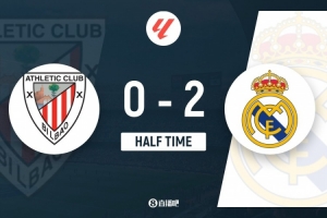 上半場傷停補時2分鐘,半場結(jié)束,皇馬暫2-0畢爾巴鄂競技。