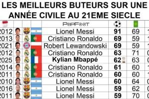 姆巴佩今年還剩4場比賽,仍有希望沖擊2013年C羅的69球、2021年萊萬的69球和2012年C羅的63球。但在這份榜單上,2012年梅西的91球仍遙不可及。