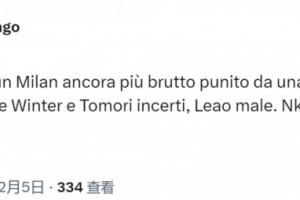 米蘭跟隊記者隆戈在社交媒體上寫道:“一場糟糕的比賽,米蘭表現(xiàn)更是糟糕,被更具求勝信念的拉齊奧懲罰。德溫特和托莫里表現(xiàn)不穩(wěn),萊奧發(fā)揮不佳,至于恩昆庫——看過比賽的人都會問,他到底在哪里?”