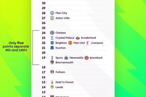 英超官方曬出積分榜,第4名切爾西與第14名伯恩茅斯之間只相差5分,積分榜中上游球隊(duì)的積分非常接近。