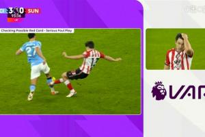 體育資訊12月07日訊 英超第15輪,曼城對陣桑德蘭。補(bǔ)時階段,奧尼恩蹬踏努內(nèi)斯,裁判一開始出示黃牌。