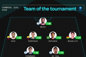 體育資訊9月10日訊 南美世預(yù)賽最后一輪比賽戰(zhàn)罷,Sofascore根據(jù)球員本屆南美世預(yù)賽的場均評分列出最佳陣容,梅西領(lǐng)銜,拉菲尼亞、J羅、迪亞斯、恩佐在列。