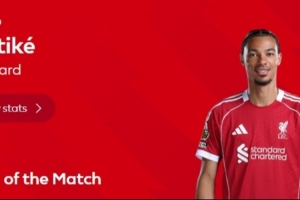 據(jù)賽后英超官方消息,利物浦前鋒埃基蒂克被評選為此役最佳球員。