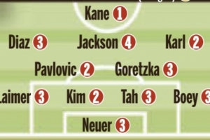 諾伊爾3分、萊默爾3分、金玟哉2分、塔3分、博伊3分、帕夫洛維奇2分、格雷茨卡3分、卡爾2分、迪亞斯3分、杰克遜4分、凱恩1分