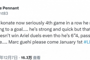 彭南特寫道:“我真是受夠科納特了,這已經(jīng)是他連續(xù)第四場比賽犯錯導致失球了……他雖然身體強壯速度快,但僅此而已,技術簡直糟糕透頂,明明身高1米93卻連空中對抗都贏不了,傳球水平跟業(yè)余聯(lián)賽球員沒兩樣,格伊請務必在1月1日加盟利物浦。”