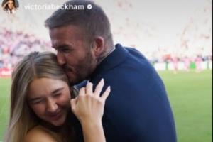 在奪冠現(xiàn)場(chǎng),邁阿密國(guó)際老板貝克漢姆與家人一起慶祝奪冠,在維多利亞曬出的圖中,貝克漢姆親吻小七。