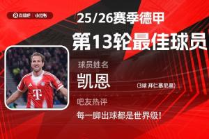 第13輪評(píng)選結(jié)果結(jié)出爐,凱恩替補(bǔ)登場(chǎng)30分鐘上演帽子戲法,助拜仁大勝斯圖加特,獲得吧友超2.7萬票支持,當(dāng)選【體育資訊X小紅書德甲第13輪最佳球員】!