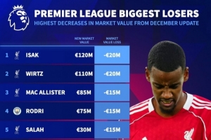 體育資訊12月9日訊 德轉更新英超球員身價,伊薩克、維爾茨均-2000萬歐,為本次更新身價下降最多的英超球員。