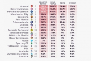 體育資訊12月9日訊 本賽季歐冠聯(lián)賽階段第6輪的比賽即將開打,opta在當(dāng)?shù)貢r(shí)間12月9日對(duì)本賽季歐冠的形勢(shì)進(jìn)行了新一輪預(yù)測(cè),阿森納奪冠概率22.6%最高,拜仁、巴黎排在二三位。