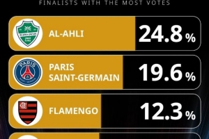 體育資訊12月10日訊 環(huán)球足球獎公布了2025年最佳男足俱樂部的投票情況,目前吉達國民24.8%領(lǐng)跑,巴黎、弗拉門戈二三位。