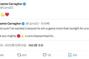 體育資訊12月10日訊 利物浦1-0客勝國米,卡拉格轉(zhuǎn)發(fā)了賽前談薩拉赫的推文,并配文:拿下!