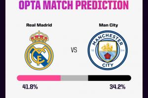 數(shù)據(jù)預(yù)測(cè)顯示,皇馬本場(chǎng)比賽的勝率為41.8%,曼城客場(chǎng)取勝的概率則為34.2%,這意味著有24%的概率出現(xiàn)平局。