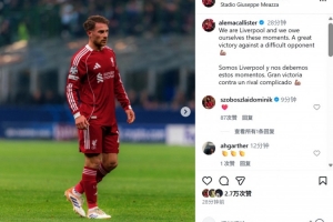本場比賽麥卡利斯特表現不俗,他也在個人社媒曬出本場照片,配文寫道:“我們是利物浦,我們值得這樣的時刻。對陣強敵取得了一場很棒的勝利!”