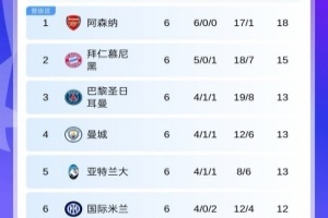 6輪過后,阿森納6戰(zhàn)全勝領(lǐng)跑,基本鎖定前8席位,曼城升至第4,皇馬跌至第7,本菲卡兩連勝靠近附加賽區(qū),重燃晉級希望。