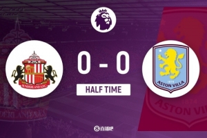傷停補(bǔ)時(shí)3分鐘。上半場(chǎng)比賽結(jié)束,桑德蘭0-0阿斯頓維拉。