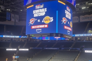 在雷霆比賽的中途,俄城大屏幕預(yù)告NBA杯半決賽雷霆vs湖人,結(jié)果湖人被淘汰了。