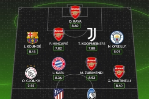 體育資訊12月11日訊 WhoScored根據(jù)球員的評(píng)分列出了歐冠第6輪最佳陣容,馬丁內(nèi)利、卡爾、孔德、拉亞在列,阿森納4名球員入選。